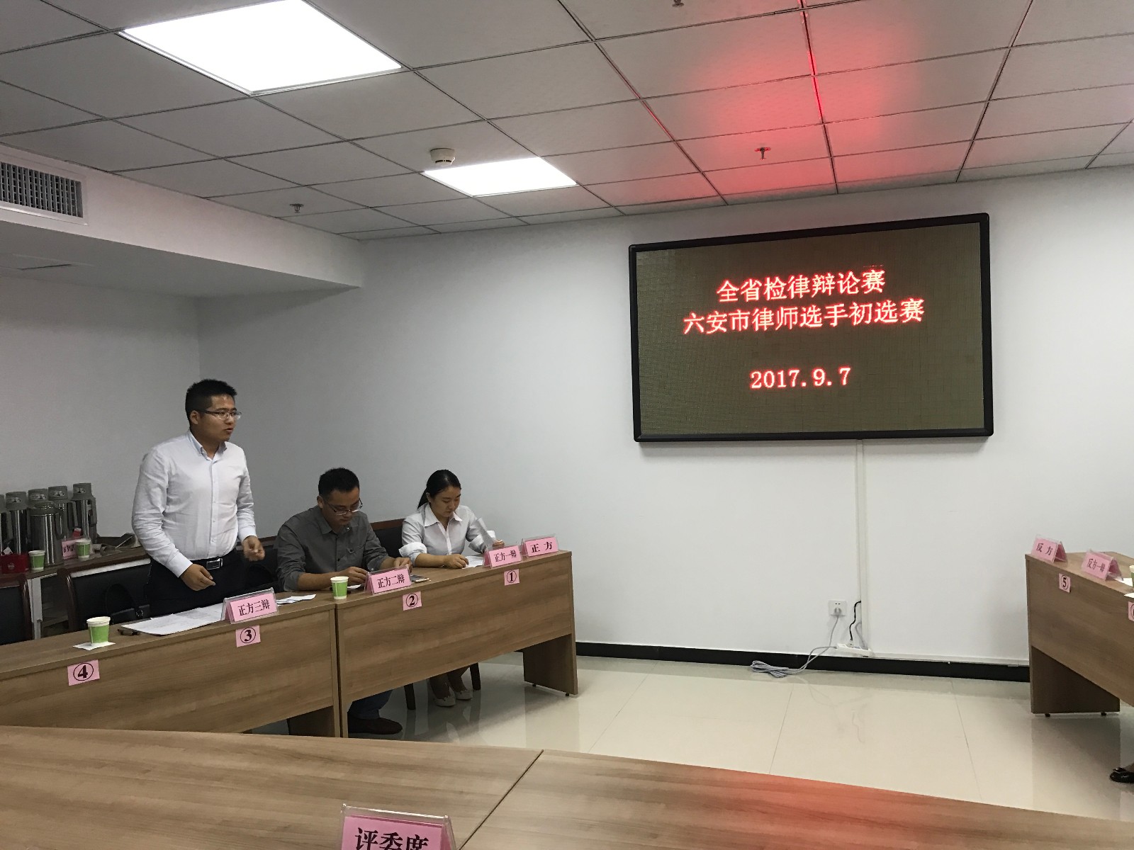 为参加全省首届检律辩论赛,9月7日下午市律协举办六安市律师选手初选赛。全市计有6名青年律师报名并到场参选,市律协会长、副会长担任评委。初选赛由副会长兼秘书长蔡强主持。