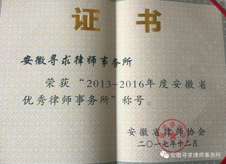 2018年3月12日,在省律协九届四次理事会上,省律协对获得“第五届安徽省十佳律师暨2013—2016年度安徽省优秀律师事务所 安徽省优秀县域律师事务所 安徽省优秀律师 安徽省优秀县域律师”等荣誉的单位和个人进行了表彰,安徽寻求律师事务所因业务能力突出、整体综合实力强等优势,获得“2013—2016年度安徽省优秀律师事务所”荣誉称号,这是安徽寻求律师事务所自获得“2009—2012年度安徽省优秀律师事务所”以来再度蝉联该项荣誉称号,也是六安市律师事务所中唯一一家获得该项殊荣的单位。这是全省律师行业的最高荣誉,也是对安徽寻求律师事务所综合实力的充分肯定!荣誉得之不易,我们倍感珍惜;全体寻求人将不忘初心,砥砺前行!